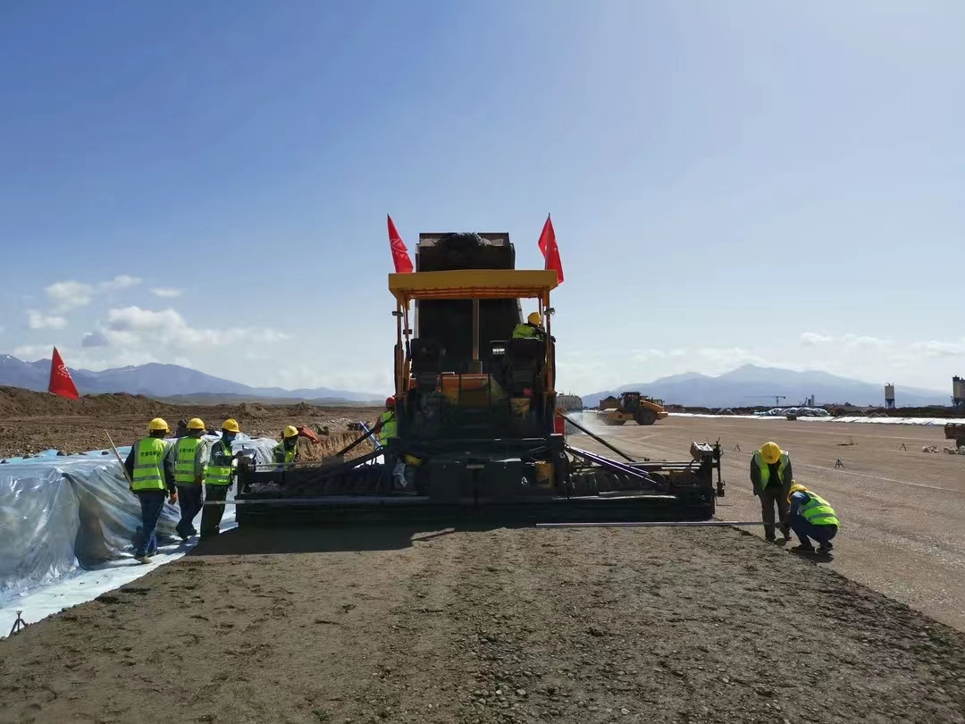 5月28日,伴隨著第一車水泥穩定砂礫混合料緩緩倒入攤鋪機料斗,標志著由我司承建的新疆和靜(巴音布魯克)機場飛行區跑道水穩基層試驗段施工正式拉開序幕。